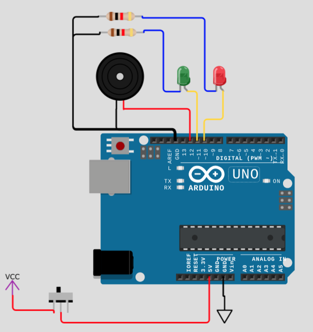 This loop continues indefinitely, alternating between the red and green LEDs, and sounding the buzzer every time a new LED is turned on.